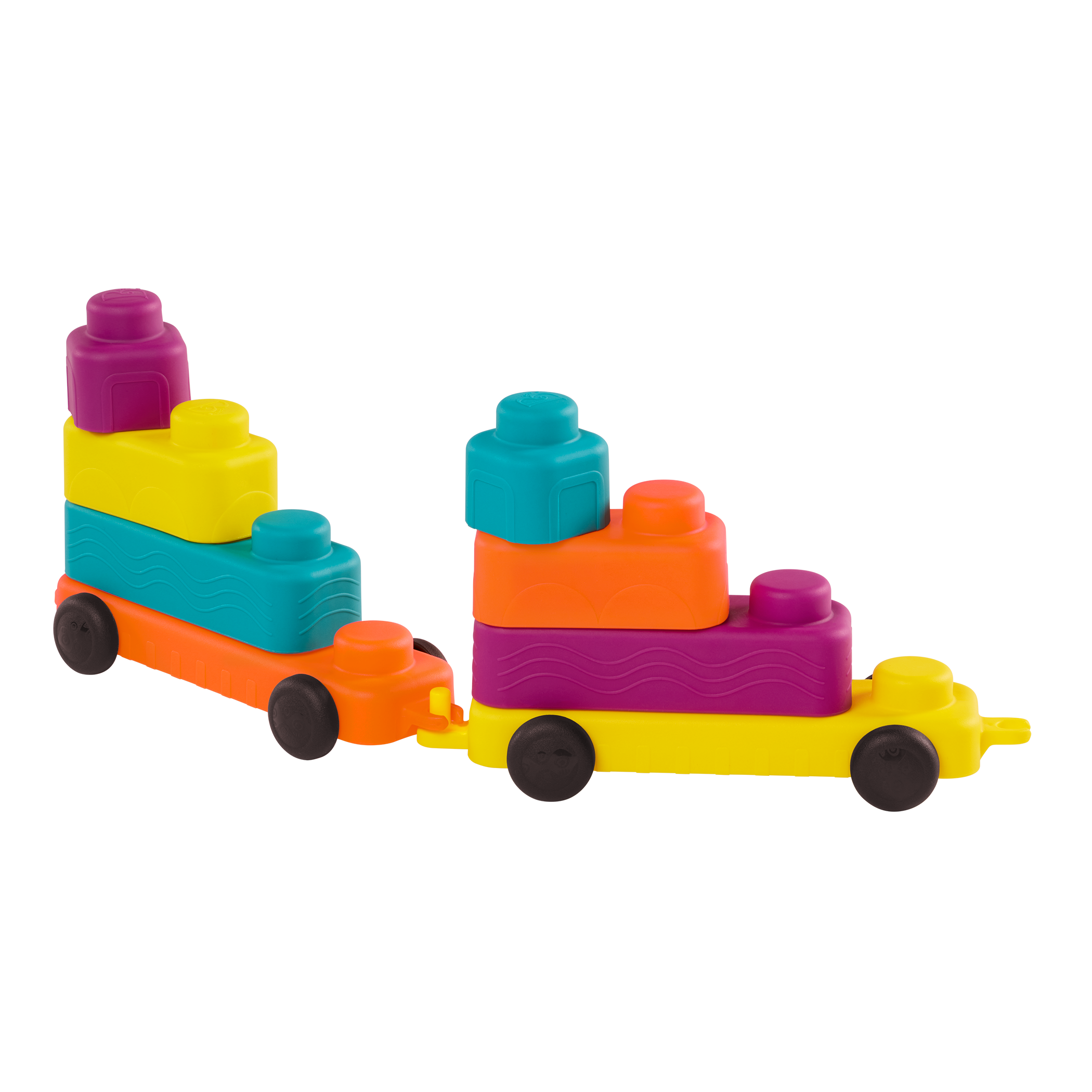 Stack, squeeze, and roll into playtime with the Buildin’ Squishies from B. toys! These building blocks let babies toss and stack as much as they like thanks to their soft and squishy design. These sensory baby blocks feature textured designs to aid sensory stimulation and development, all while keeping booboos away! They also come with 3 unique build-on cars that little ones can link together to make a lil’ train. As kids grow, they’ll go from basic exploration play to construction play – choo-choo! These soft building blocks are a great choice as first baby blocks and come in a reusable bag for easy transport and storage. Recommended for babies 3 months and over.