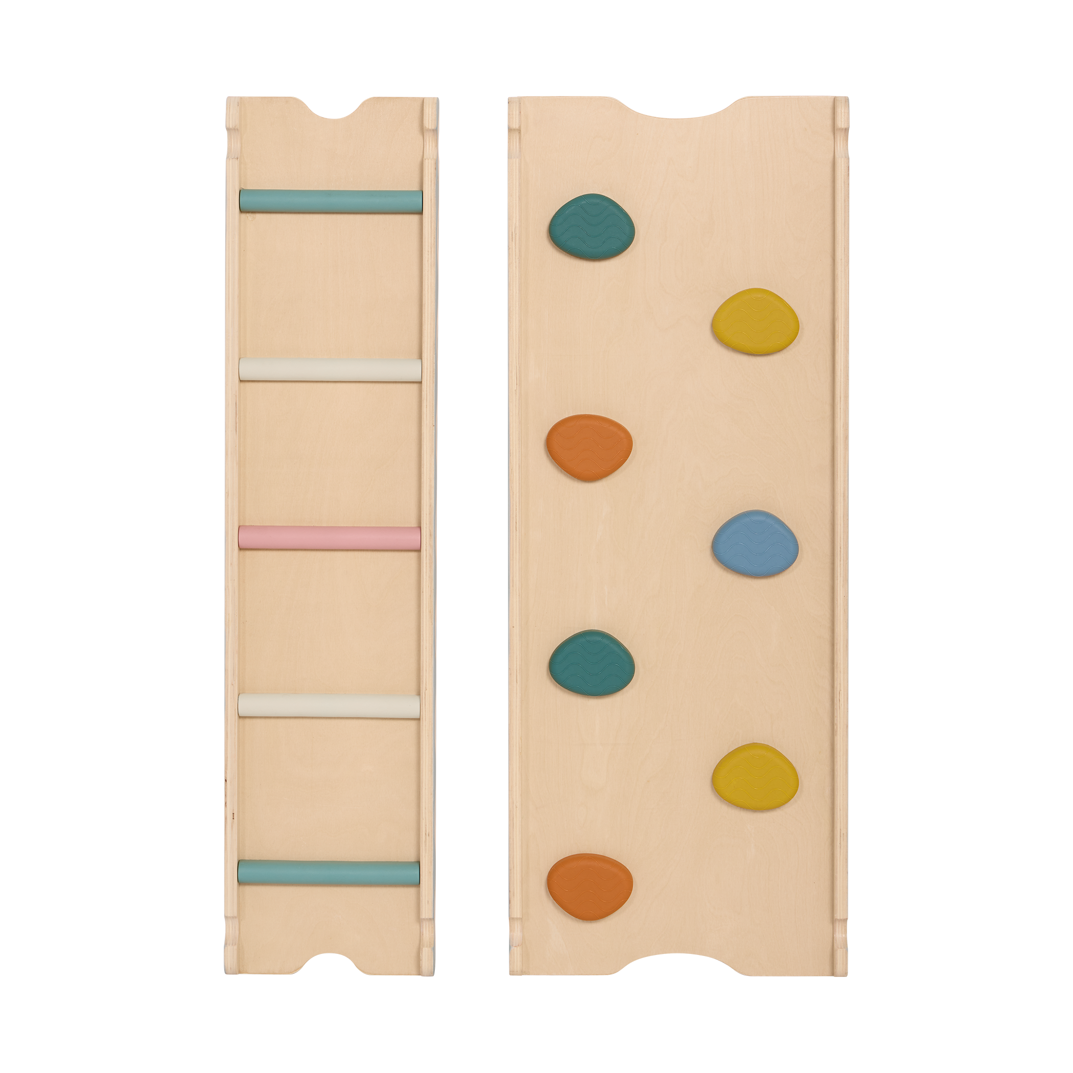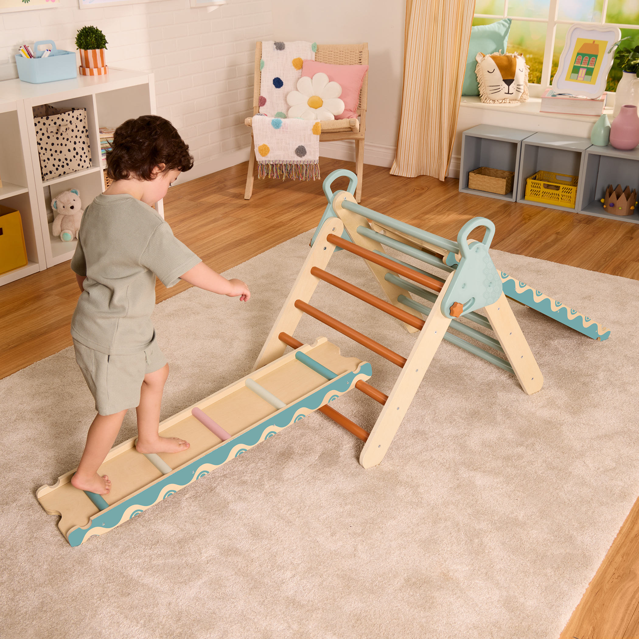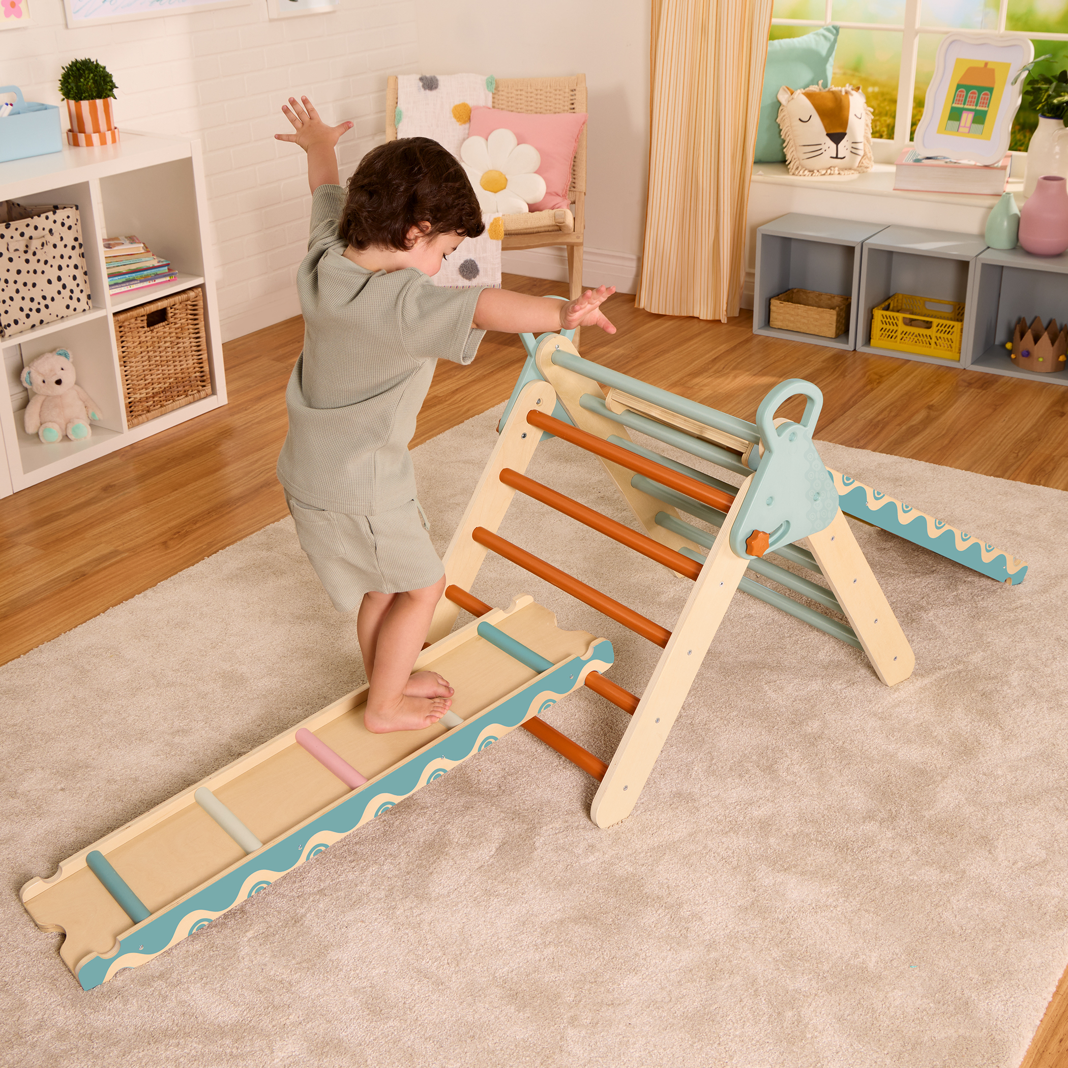 Climb, balance, and slide while staying inside with the WonderClimber from B. toys! This wooden Pikler Triangle playset is ready for lil’ explorers to crawl over, climb up, and hang around on. In addition to the triangle climber, there are two reversible ramps for loads of creative configurations—flip ’em over to go from climbing bars and holds to slides! Toddlers and young kids will love incorporating the WonderClimber into their play, and they’ll be improving their physical coordination while they’re at it. Wooden triangle climbers are a great way to bring active play indoors in all seasons, and parents will appreciate the folding, space-saving design when it’s time to clean up! It’s time to get those lil’ climbers and sliders movin’! Recommended for children 18 months and over.